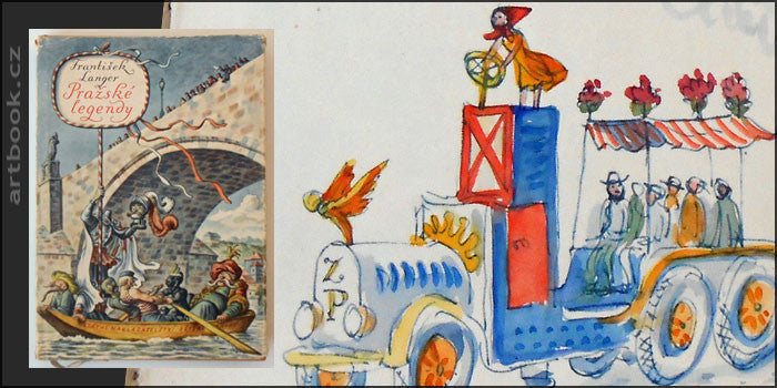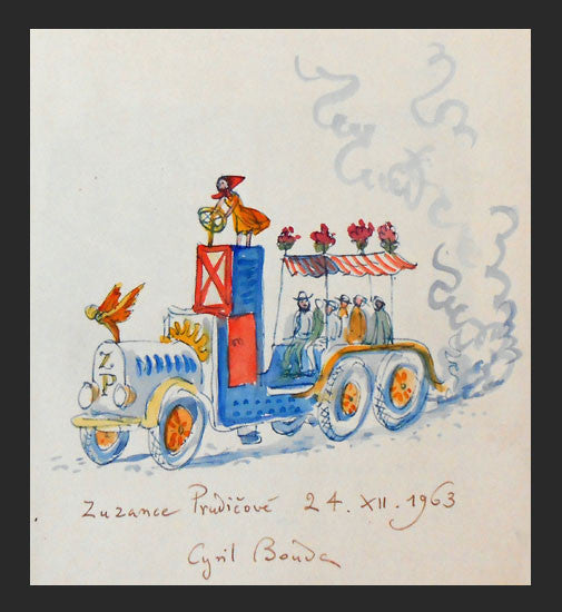Akvarelová kresba s dedikací dat. 24.12. 1963.Na Štědrý den nakresleno 'Zuzance' na stranu patitulu knihy Františka Langra. Pražské legendy. 1. vyd. Praha: SNDK; 1956. Viz další obrázky.