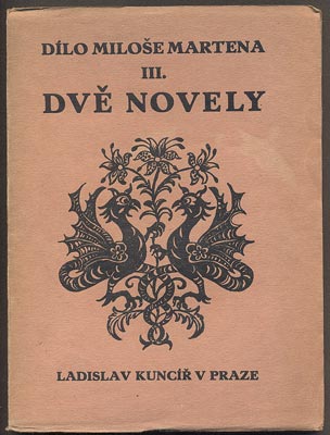 Praha, Kuncíř, 1927. Dilo Miloše Martena 3. 49 s., ilustrace a úprava Zdenka Braunerová: obálka, titulní list, iniciály, viněty. Čísl. ex. 372/500, (exempláře 1-5 na ručním papíře Van Gelderově, 6-100 na simili japanu). Na rubu přední ob. dvoubarevné, typografické ex libris Františka Dvořáka. Pův. brož. 205x155 Na obálce nepatrná světlá skvrna viz druhý obr., jinak velmi dobře zachováno. /dekadence/