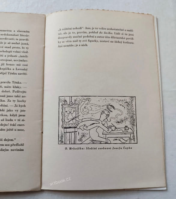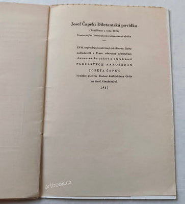 S autorovým frontispicem a obrazem na obálce. XVII. neprodejný soukromý tisk Kmene, klubu nakladatelů v Praze, pro účastníky slavnostního večera u příležitosti padesátých narozenin Josefa Čapka.