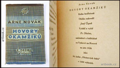 Kniha feuilletonů. Vyškov; Obzina; 1926. 24. kniha 'Obzinových tisků'; 1000 výt.; 178 s.; obálka (dvoubarevné lino) JOSEF ČAPEK. Pův. brož. 215x135 Titulní list s podpisem původního majitele.