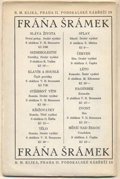 Komedie o třech dějstvích. Praha; Klika; 1923. Zátiší; Knihy srdce i ducha. Opona sv. IX. 81 s.; ukázky scén B. FEUERSTEIN; obálka (dvoubar. lino) JOSEF ČAPEK; typo V. H. BRUNNER. Pův. brož. 220x150. - Horní okraj obálky mírně nahnědlý. Na titulním listě podpis perem předchozího majitele.