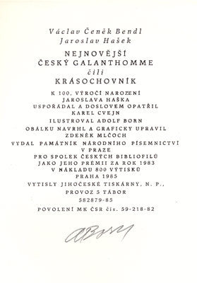 K 100. výročí narození J. Haška - Praha, Památník národního písemnictví pro Spolek českých bibliofilů, 1985. 29 s., 3 serigrafie a podpis v tiráži ADOLF BORN, obálka a úprava ZDENĚK MLČOCH, Volné dvoulisty v pap. složce. 240x135