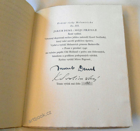 4 suché jehly KAREL SVOLINSKÝ - Praha; Melantrich; 1940. Krásné tisky Melantricha; sv. 3. 41 s.; grafická úprava; obálka a 4 celostr. suché jehly KAREL SVOLINSKÝ; ex. 132/200 na ručním papíře Old Holland; podpis výtvarníka a podpis autora v tiráži. Pův. brož. 220x190.