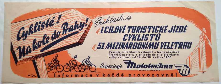 Reklamní plakát. "Přihlaste se k I. cílové turistické jízdě cyklistů, k 51. mezinárodnímu veletrhu. Den startu a příjezdu od 14. do 30. května 1950. Organisuje : Mototechna. 220x600 Stopa po přeložení.