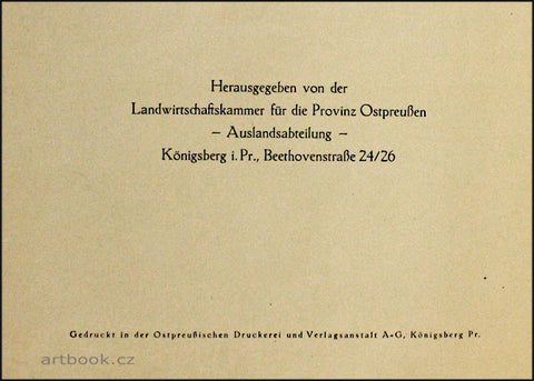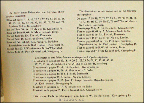 Gedruckt in der Ostpreußischen Druckerei und Verlagsanstalt A-G. Königsberg Pr. (1931). Titel und Federzeichnungen von Maler W. Wolfermann, Königsberg Pr. 79 str., množství čb. fotografií, il. v textu, 1 bar. celostr., mapa. Německý, anglický, ruský a španělský text. Pův. brož. 210x290 Jeden list uvolněný, obálka mírně zašlá vlivem stáří. V době vystavení na artbook.cz jde o jediný původní exemplář, který se na trhu vzácných knih nabízí. Tituly, které se ve světě v nabídkách několika antikvariátů, dají dohledat za 390 euro jsou pouze reprinty.