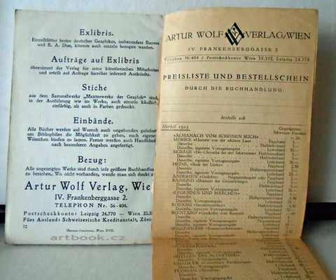 Wien, Artur Wolf, 1924. 72 s.,, na rubu zadní ob. slořený seznam 112 titulů nakladatelsví Artura Wolfa, včetně prodejních cen. Pův. brož, 180x125 Drobná ztráta pap. spodního okraje přední obálky, zadní obálka podél hřbetu natržená, hřbet při dolním okraji odřený.
