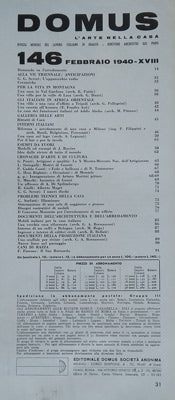 N. 146, febbraio 1940 - XVIII. Milano, Editoriale Domus. Dirett. resp. : Gianni Mazzocchi - Printed in Italy - Stampa. 91 s. Sešit. 325x245 Hřbet místy otřepený. /H/