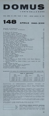 N. 148, aprile 1940 - XVIII. Milano, Editoriale Domus. Dirett. resp. : Gianni Mazzocchi - Printed in Italy - Stampa. 101 s. Sešit. 325x245 /H/