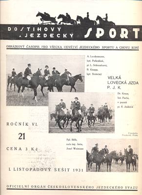 Roč. VI., I. listopadový sešit, č. 21. Praha, A. Stýblo, 1931. Zodpovědný redaktor Jan Hahnenkam. 12 s., mj. obsahuje: Velká lovecká jízda Pražského Jezdeckého klubu. Olympijská dresura v Pardubicích. Sešit. 310x230 Velmi dobře zachováno.