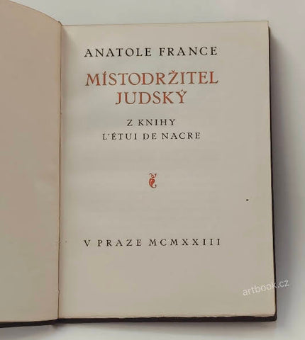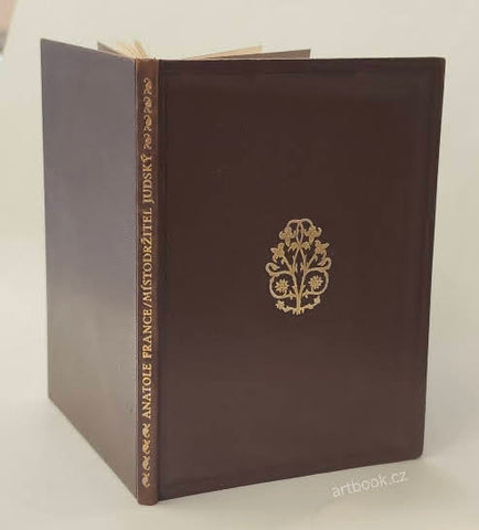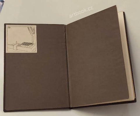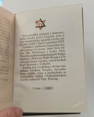 Kožená vazba JOSEF BROUSEK. - Praha; Dyrynk; 1923. Přeložil Karel Dyrynk. 31 s.; typograficky upravil KAREL DYRYNK; nakl. značka VOJTĚCH PREISSIG; dvě iniciály GEOFROY TORY; dvoubarevný tisk; 276 ex. na holandském papíře vytiskla Genzschovou antikvou Státní tiskárna v Praze. Ručně čísl. výtisk 141. Na předním přídeští Dyrynkovo exlibris od Vojtěcha Preissiga. Do celokožené vazby svázal JOSEF BROUSEK v Unhošti; zlaté ořízky. 162x117 Krásný stav!