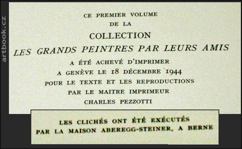 Genève-Paris Éditions des Trois Collines, 1944. 168 s. včetně 96 fotografických reprodukcí na křídových přílohách, 1 bar. mont. reprodukce (Clown), 1 celostr. jednostranně tištěná reprodukce kresby a množsví dalších reprodukcí tištěných v textu. Celopl. vazba, vzadu vev. obálka. 240x180