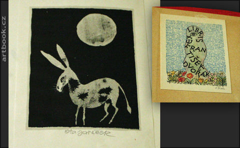Na přídeští ex libris Františka Dvořáka, sign. lito V. Fiala, z rubu titulního listu montovaná litografie Oty Janečka, sign., na titulním listu mont. iniciála JM.