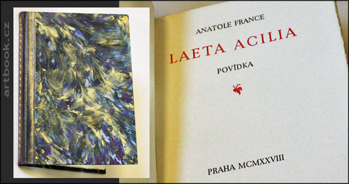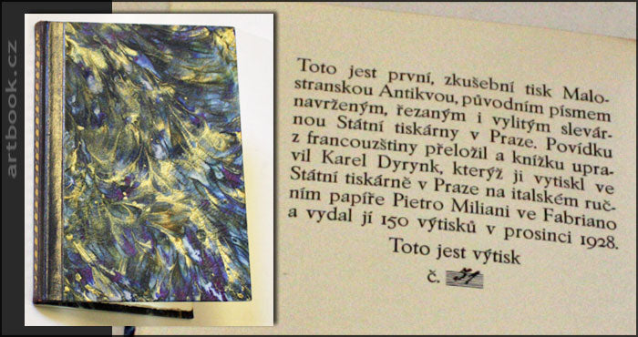 Praha, Karel Dyrynk, 1928. 24, [4] s. Z francouzštiny přeložil a knížku upravil Karel Dyrynk, který ji Malostranskou antikvou vytiskl ve Státní tiskárně v Praze na italském ručním papíře Pietro Miliani ve Fabriano. Dvoubarevný tisk. Ručně čísl. (černě, perem) exemplář 51/150.