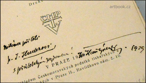 Dedikace autora, dat. 1929.Třetí kniha "Karlovských povídek". Druhé vydání. V Praze, Nákladem Českomoravských podniků tiskařských a vydavatelských, 1928. 268 stran, 7 nečíslovaných listů obrazových příloh, obálka Artuš Scheiner.Pův. brož. 185x140