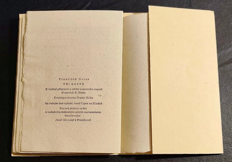 Prostějov, Josef Glivický, 1966. K vydání připravil a ediční poznámku napsal František X. Halas. Front. kresba FRANTY BIDLA. 12 s. Na ručním lisu vytiskl Josef Cipra na Kladně, dvoubarevný titulní list. Počet výtisků neuveden. Volné dvoulisty v pův. pap. obálce, ruční papír. 155x110