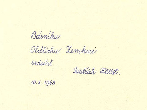 Podpis autora - Kladno, soukromý tisk, 1963. Vytištěno u příležitosti 70. narozenin básníkových. (16) s., 30 výt. jako soukromý tisk Josef Cipra, dedikace s podpisem "Básníku Oldřichu Zemkovi" Jindřich Hauft, dat. 10. X. 1963. Brož. Volné dvoulisty v pap. obálce. 250x175 /Ate0423/