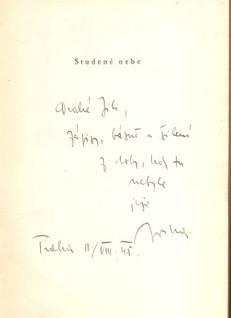 Podpis autora - Praha, Václav Petr, 1944. 1. vyd. Lyrika sv. 9. 80 s., úprava Jaroslav Šváb, kresby Arnošt Paderlík, dedikace s podpisem autora, dat. 2. 8. 1945. Polopl. vazba. 205x150 /Ant24/