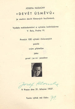 Souhrn devíti filmových feuilletonů o J. Beránkové; H. Buschové; V. Ferbasové; N. Gollové; A. Mandlové; K. Oličové; S. Svozilové; B. Tringlerové; H. Vítové. Praha; V. Reis; 1937. Nestr. (60) s.; 9 fotogr. portrétů. Dedikace a podpis autora s dat. 1937 v titulu a podpis autora v tiráži; exemplář č. 71 ze 100 čísl. výtisků. Pův. brož. 220x155 Na titulu nahnědlé stopy po lep. pásce. Na povrchu hřbetu a obálky drobné oděrky, jinak čistý exemplář bez dalších vad.