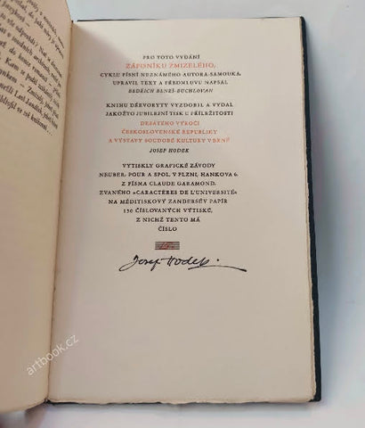 Ilustrace (dřev.) JOSEF HODEK, podpis v tiráži. 40 s. , ex. 15/150. Pův. celokožená vazba, zlatá ořízka. Krásný stav!