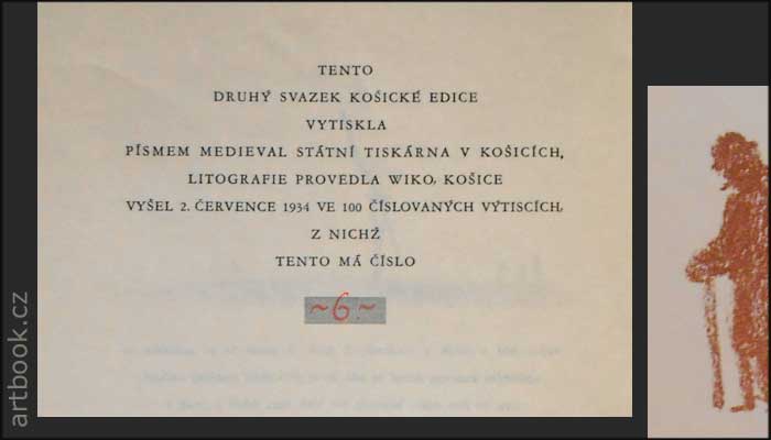 Košice, 2. červenec 1934. 19 s. původních litografie, (na přední i zadní s. obálky, na titulním listě, jeden celostr. portrét, 13 v textu. Náklad 100 čísl. výtisků, tento exemplář číslo 6. Pův. šitá brož. volně vložená do obálky. 315x230