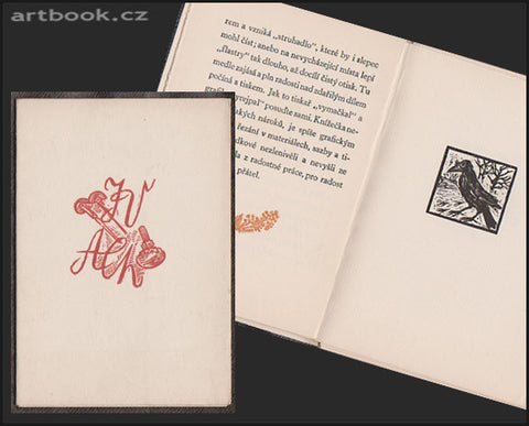 JAROSLAV VODRÁŽKA a ALOIS CHVÁLA svým přátelům drobný grafický pozdrav. Úvodní text (4)s. Alois Chvála, 14 drobných čb. dřevorytů (každý tištěný na straně samostatně), hnědě tištěný dřevoryt na ob. a v textu tři drobné viněty Jaroslav Vodrážka. Grafická úprava a tisk: na ručním lisu Alois Chvála. Volné dvoulisty v pův. pap. obálce. 150x110 /zbr 0222/