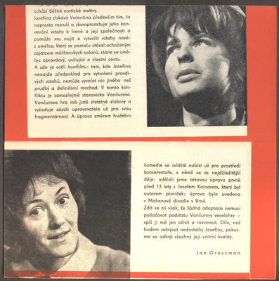 Divadelní program. Divadlo S. K. Neumanna v Praze. Režie: Jan Fišer. (12) s. + vložený list dva texty P. Kopty k písním J. Srnce, gr. úprava J. Dubská. Hráli: J. Tvrzníková; Z. Hadrbolcová ... Pův. sešit. 200x100 /Ate/