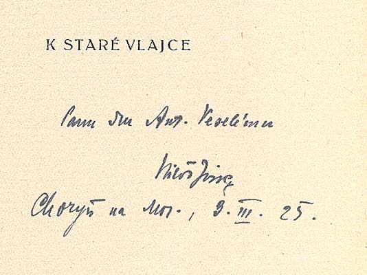 Podpis autora - Básně. Praha, Lad. Kuncíř, 1925. Knihy mladých VI. Pořádal Jaroslav Durych. 92 s., upravil V. H. BRUNNER, dedikace s podpisem autora, dat. 9. III. 1925. Pův. brož. 155x105 /H/