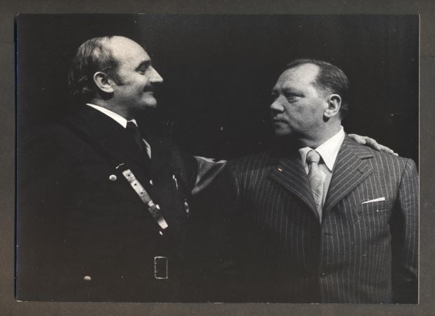 Černobílá fotografie z divadelní hry Karel Čapek: Bílá nemoc (1980). Malomocný-Maršál: Josef Somr. Malomocný-Baron Krüg: Rudolf Hrušínský. Foto JAROMÍR SVOBODA, razítko na rubu, nedatováno. 180x230