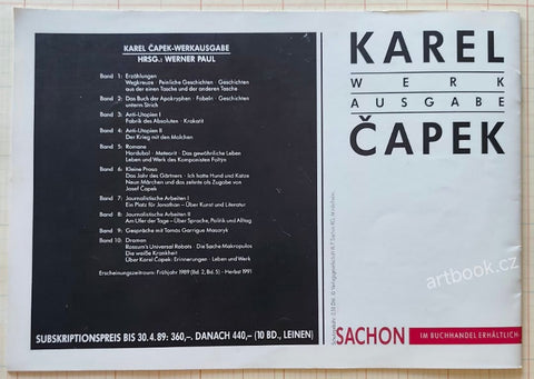 Nakladatelský tisk k zahájení subskripce na desetisvazkové Dílo Karla Čapka, zájemci si mohli do 30.4.1989 celé dílo v plátěných vazbách pořídit za subskripční cenu 360 DM, poté se mělo prodávat za běžnou cenu 440 marek.