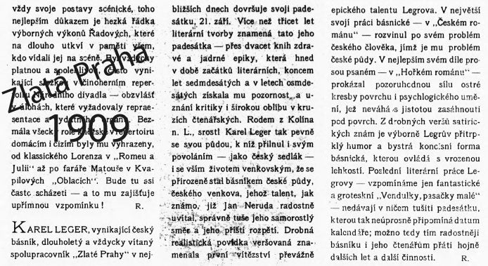 Na dalším obr. reprodukujeme sloupek ze Zlaté Prahy, 1909, č. 52. v němž redaktor připomíná že v nejbližších dnech 21. září, dovršuje spisovatel svoji padesátku a přináší stručný přehled jeho třicetileté tvorby.