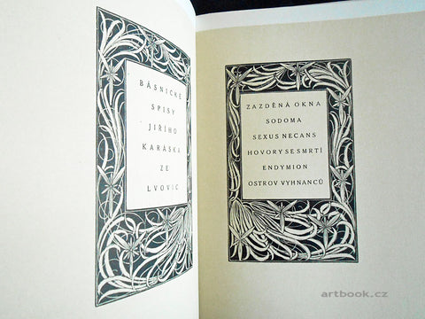 Soubor dvaceti titulních listů a protititulů. Praha; Grafická škola; 1944. 20 dvoulistů; reproduce provedeny offsetem ve školních dílnách ve 300 výtiscích. Volné dvoulisty v pův. obálce. 290x230