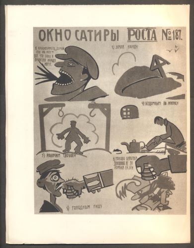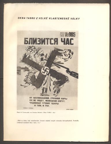 Praha, Družstvo Dílo přátel umění a knihy, 1945. 1. vyd. Živé dokumenty sv. 1. 55 s. (22 celostr. reprodukcí), obálka a graf. úprava Jan Kotík. Satirické politické plakáty tiskových kanceláří Ruska s průvodním textem. Volné dvoulisty v pap. obálce. 260x200 Obálka na hřbetě poškozená, podlepená pap. páskou, jinak dobře zachováno. /Ate/