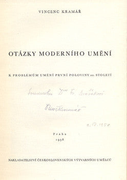 K problémům umění první poloviny 20. století. Praha, NČSVU, 1958. Kritika a polemika sv. 2. 1. vyd. 98 s. (36 čb. vyobrazení), obálka, vazba a úprava JAN KOTÍK, dedikace s podpisem autora, dat. 1. IV. 1958. Pův. celopl. vazba s obálkou. 210x155 Obálka poškozená.