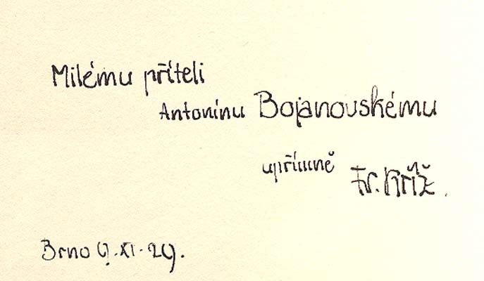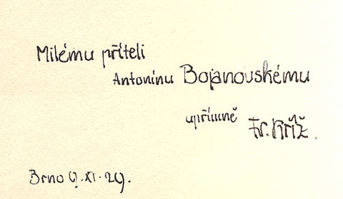 Brno, vydal autor, 1929. 42 s., 2 sign. dřevoryty FERD. DUŠA, dedikace s podpisem autora, dat. 9. XI. 29., výt. č. 6/120 vytiskli Kryl a Scotti v Novém Jičíně. Pův. brož. 195x120