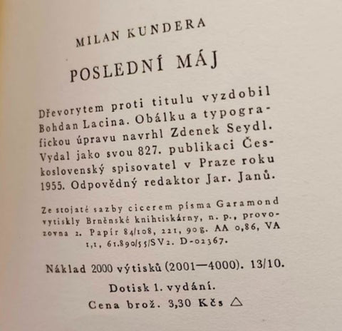 Praha; Československý spisovatel; 1955. 39 s.; dřevoryt BOHDAN LACINA; obálka a úprava ZDENEK SEYDL. Pův. brož. 210x140 Dobře zachováno. Druhá kniha Milana Kundery.