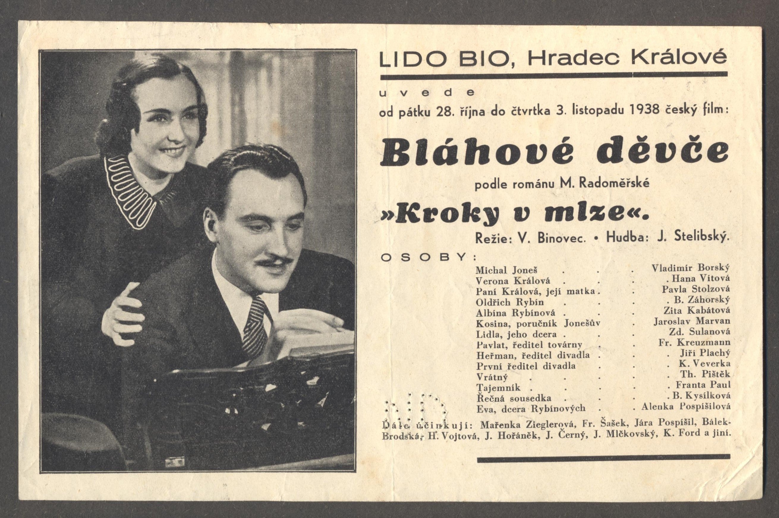 Filmový leták. LIDO BIO v Hradci Králové od pátku 28. října do čtvrtka 3. listopadu 1938. Režie: V. Binovec. Hrají: Hana Vítová, Vl. Borský ... 135x210 /Ate/