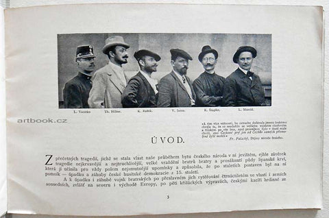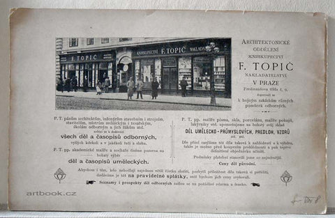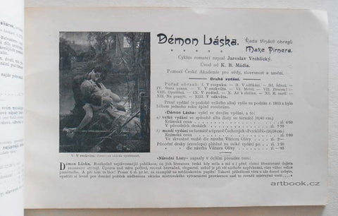 Praha, F. Topič, [1898]. 8 s. textu, 8 listů s jednostrannými čb. reprodukcemi díla "Bitva u Lipan", 4 listy s výběrem vydavatelské produkce F. Topiče. V úvodu skupinový fotogr. portrét L. Marolda, V. Jansy a čtyř spolupracovníků podílejicích se na realizaci díla "Bitvy u Lipan". Pův. brož. 145x230 Velmi dobře zachováno (s ohledem na malý výskyt exemplářů, jež pohříchu, obvykle nacházejí se v žalostném stavu).