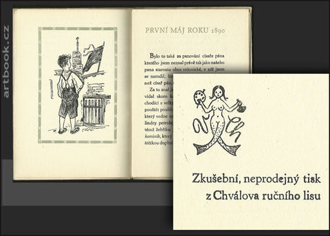 Svým přátelům k úvaze a pro potěšení. Prosinec 1961. Zkušební, neprodejní tisk z Chválova ručního lisu. 17. s., Jar. Vodrážka: Neznámé arcidílo. Alois Chvála: První máj roku 1890. Dvě celostr. ilustrace. Volné dvoulisty v pův. pap. obálce. 150x110