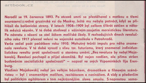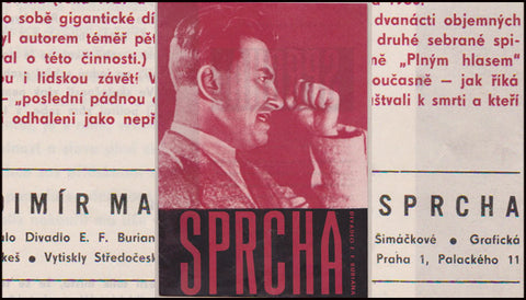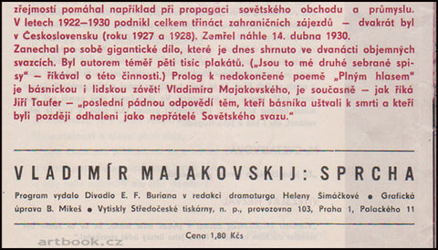 Program Divadla E.F. Buriana. 1963. Grafická úprava B. Mikeš. 8 listů včetně obálky. 3x div. fot. s. Vítězoslávka (Ilja Racek), 3 celostr. portrétní fot. Vl. Majakovského. V textu mj.: b. Majakovského (přel. J. Taufer), b. J. Jevtušenka (přel. Karel Šiktanc), úryvky ze vzpomínek na Majakovského (Erenburg, Hoffmeister, Konrád, Cvetajevová, Nezval), úryvek projevu N.S. Chruščova.