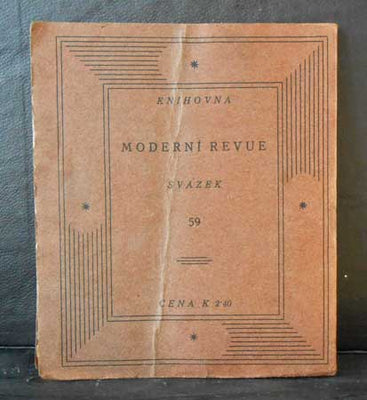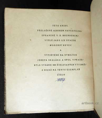 Přeložil Alois Navrátil (=Arnošt Procházka). Knihovna Moderní revue sv. 59.Praha, Moderní revue, 1915. Vytiskl Josef Skalák v Praze. 51 s., obálka, frontispis a úprava V. H. BRUNNER, dvoubarevný titulní list. Na patit podpis původního majitele. Čísl. ex. 114/300. Pův. brož. 180x150 Zadní obálka se stopou po přeložení, ořízky a první list a zadní vakát od prachu, na obálce málo patrná skvrna od tekutiny, na zadním vakátu otisk barvy obálky. /1021 zbr/