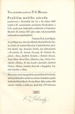 Přednáška prof. T. G. Masaryka v Kroměříži dne 15. a 16. dubna 1905. Kroměříž, nákladem vydavatelů, 1937. 49 s., dřevoryt a úprava KAREL SVOLINSKÝ, ex. č. 167 ze 170 číslovaných (vydáno 540 neprodej. výt.), v tiráži podpis K. Svolinský, vytiskl Karel Kryl v Novém Jičíně na ručním losínském papíře. Dvoubarevný tisk titulního listu a obálky, v úvodu červeně tištěná první řádka a iniciála P s českým lvem. Dobová polopl. vazba s obálkou vzadu vevázanou. 235x160