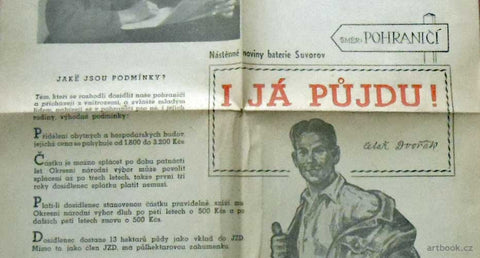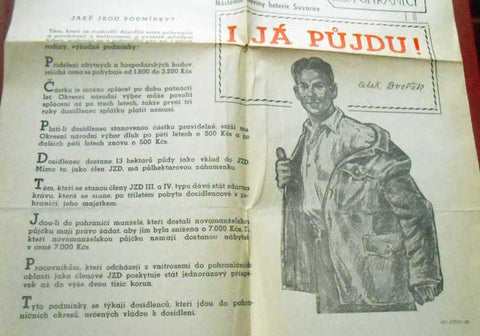 Vládní pobídky pro občany "dosídlence" za účelem dosídlení pohraničních okresů.Novinový pap. Složený dvoulist. 450x580