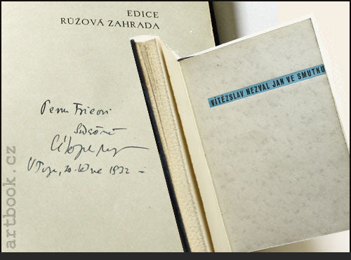 Praha, B. Janda, Sfinx, 1930. Edice Růžová zahrada sv. I. 103 s., obálka a typo Jindřich Štyrský, podpis a ded. autora dat. 1932. Krásná polokožená vazba, zlatá vrchní ořízka, na hřbetě zlacená ražba titulu, obálka vev. vzadu. 210x155
