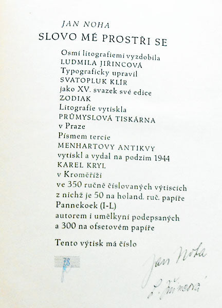 Praha; Klír; 1944. Typograficky upravil Svatopluk Klír. XV svazek edice Zodiak. 82 s.; 8 litografií Ludmila Jiřincová její podpis; spolu s podpisem autora Jana Nohy; v tiráži. Litografie vytiskla Průmyslová tiskárna v Praze. V tiráži rovněž uvedeno 'Vytiskl a vydal Karel Kryl v Kroměříži'. Dob. polokožená vazba. 250x177 Desky mírné prohnuté.