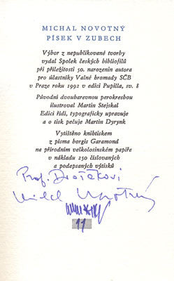 Praha, Spolek českých bibliofilů, 1992. Edice Pupilla sv.8. 18 s., perokresba MARTIN STEJSKAL (sign.), ex. č. 11/250 podpisy autorů v tiráži, přírodní papír. Pův. brož. 135x88