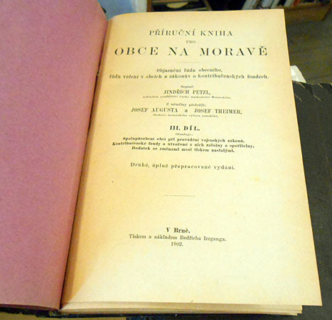 Objasnění řádu obecního; řádu volení v obcích a zákonův o kontribučenských fondech. Brno; Bedřich Irrgang; 1902. Druhé, úplně přepracované vydání. Z něm. přel. Jos. Augusta.
