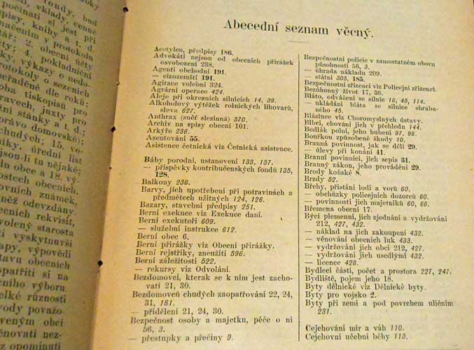 I. díl Řád obecní, řád volení v obcích a onu část působnosti obcí, která se týká volné správy obecního majetku a záležitostí ke svazku obecnímu se vztahujících. 336 s