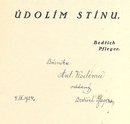 Podpis autora - Básně. Praha, Josef Mazur, 1924. 48 s., dedikace s podpisem  autora, dat. 4. IX. 1924. Pův. brož. 220x135 Nerozřezáno. /H/