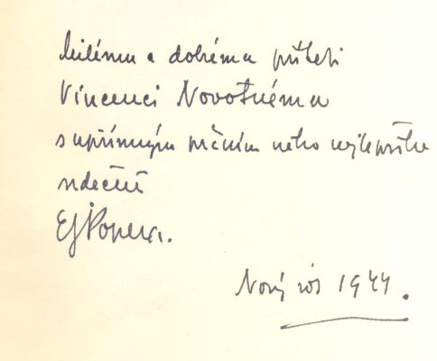 Podpis autora - Básně. Praha, Václav Petr, 1943. 1. vyd. 60 s., kresby JAROMÍR HOFMANN, obálka a úprava JAROSLAV ŠVÁB, dedikace s podpisem autora, dat. Nový rok 1944. Pův. brož. 210x140
