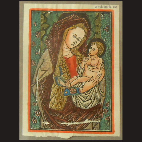 Tobolka: Brustbild der Madonna mit dem Jesuskinde vor einem Vorhang. Ein prächtiges Bild mit ornamentalen Schmuck. Wahrscheinlich die Arbeit eines Künstlers, der in den siebziger Jahren des 15. Jahrhunderts in Köln am Rhein tätig war. (W.L. Schreiber: Die Meister der Metallschneidekunst. Strassburg 1926. S. 61). Schrotblatt, eingeklebt auf der Innenseite des Vorderdeckels einer Pergamenthandschrift aus dem 15.-16. Jahrhundert "Responsoriale cuinsdam monasterii ordinis minorum notis musicis instructum", Oeffentliche und Universitätsbibliothek in Prag unter der Signatur (Ms XIII E 9). Das Blatt entspricht dem Inhalt des Buches und ist eigentlich dessen Einleitungs-Illustration.